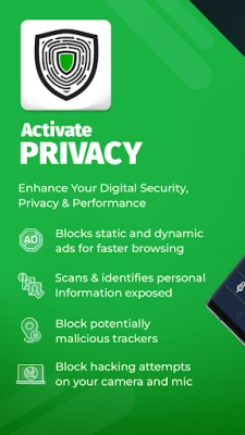 With Activate Privacy, users can also benefit from our privacy advisor feature, which monitors the apps installed on your device and categorizes them by risk level, and our permission control feature, which gives you complete control over which apps can access your private data. Our camera and microphone blockers provide added security by enabling you to instantly block or unblock camera or microphone usage on your device.