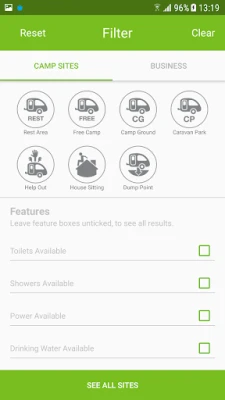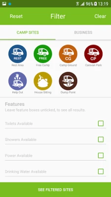 Filter your search criteria to include the features you must have at a site, including Toilets, Showers, Power, Pet Friendly etc. The site is then presented in either Map or List view in order of distance from your location.