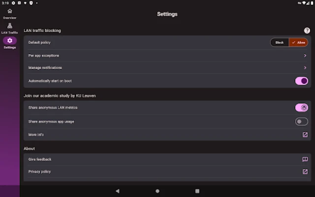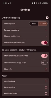 Note: LANShield uses the VpnService API to control LAN access of other apps. It does not establish any external VPN connection.