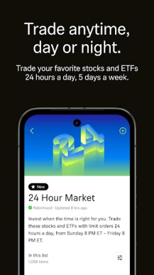 There are additional, unique risks with trading outside of regular market hours you should be aware of before making an investment decision, including the risk of lower liquidity, increased volatility, greater spreads, and pricing uncertainty. Robinhood 24 Hour Market is from Sunday 8 PM ET - Friday 8 PM ET.