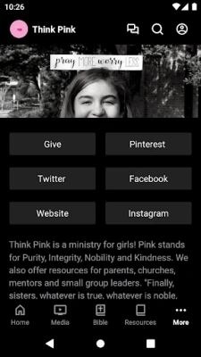 Welcome to our Think Pink App. Pink stands for PURITY, INTEGRITY, NOBILITY and KINDNESS. This app is for girls of all ages who wants to grow in their understanding of who God is and who God has created them to be. This app also has resources for parents, churches, mentors and small group leaders.