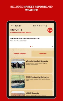 VA Cattle is a simple one-stop shop for cattle producers to be able to access information that is valuable to day to day operations. Features include cattle market reports from United State Department of Agriculture (USDA) and markets across Virginia and futures for different agricultural commodities.